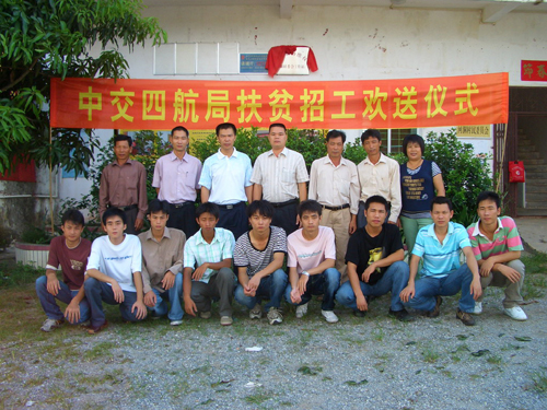 2007年6月18日,中交四航局第三批"十百千萬"駐陽西縣儒洞鎮(zhèn)河洞村工作組在駐點(diǎn)村舉行扶貧招工歡送儀式,熱烈歡送九名當(dāng)?shù)厍嗄甑綇V州中交四航局本部進(jìn)行培訓(xùn)。