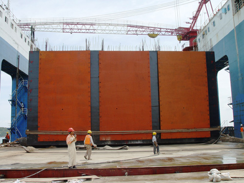 該沉箱于5月6日開始第一層澆筑,主體澆筑6月6日完成,負(fù)責(zé)出運(yùn)、安裝的主要由分公司四航東南號(hào)浮船塢完成。8月26日出運(yùn)當(dāng)天,公司工程業(yè)務(wù)部副經(jīng)理陸紅、工藝技術(shù)部鄭遠(yuǎn)斌,分公司副經(jīng)理魏遠(yuǎn)明、肖俊平等到現(xiàn)場(chǎng)作指導(dǎo),并專門召開了專題會(huì)議,經(jīng)精心策劃,周密部署,上駁、下潛、出運(yùn)、安裝順利完成,為公司承建大型號(hào)沉箱積累了寶貴的施工經(jīng)驗(yàn)。