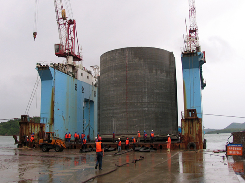 9月10、11日該工程進(jìn)行了首個(gè)圓筒安裝的典型施工,在公司、分公司有關(guān)相關(guān)人員的現(xiàn)場(chǎng)指導(dǎo)下,項(xiàng)目部領(lǐng)導(dǎo)帶領(lǐng)施工人員在"防城港"號(hào)船組人員的通力配合,冒雨作業(yè),從9月10日中午12點(diǎn)圓筒上塢,到9月11日中午12點(diǎn)順利完成安裝。