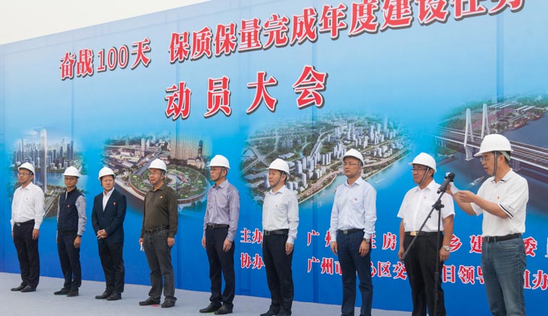 動(dòng)員大會(huì)上,廣州市中心區(qū)交通項(xiàng)目領(lǐng)導(dǎo)小組辦公室主任祖冠周闡述了“奮戰(zhàn)一百天 保質(zhì)保量完成年度建設(shè)任務(wù)”主題活動(dòng)的目的、意義和任務(wù)安排,為活動(dòng)指明了方向、注入了動(dòng)力。他表示,廣州市項(xiàng)目辦將重點(diǎn)抓好項(xiàng)目統(tǒng)籌、形象進(jìn)度、項(xiàng)目前期、質(zhì)量安全、活動(dòng)實(shí)效等五個(gè)方面的工作,全力打贏打好“奮戰(zhàn)一百天”攻堅(jiān)戰(zhàn),高標(biāo)準(zhǔn)高質(zhì)量完成好全年各項(xiàng)目標(biāo)任務(wù)。廣州市住房和城鄉(xiāng)建設(shè)委員會(huì)副主任齊懷恩宣布主題活動(dòng)正式啟動(dòng)。為全力打贏打好年度城建攻堅(jiān)戰(zhàn),齊懷恩要求:一是要思想上緊起來,振奮精神鼓勁加油;二是要行動(dòng)上干起來,攻堅(jiān)克難責(zé)任到人;三是要成效上實(shí)起來,保質(zhì)保量完成任務(wù)。