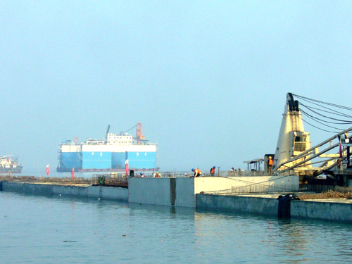 該工程于2007年7月13日正式開工,總工期321天,工程總造價(jià)1.1億元,碼頭岸線長640米。工程共需安裝沉箱32件,單件沉箱長19.95米×寬11.5米×高11.5米,重約1232,2007年8月29日開始安裝第一件沉箱。