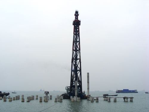 該工程共沉樁799根,樁徑為φ1.2m和φ1.4m兩種類型的預(yù)應(yīng)力砼大管樁,樁數(shù)量分別為401根和398根。施工過程中與基槽挖泥及拋砂交叉作業(yè),施工難度較大。為了確保按時完工,項目部與"樁四"船組建立了和諧、真誠合作的關(guān)系,克服重重困難,按項目部的進(jìn)度要求順利完成沉樁任務(wù),為按時完工贏得了主動。沉樁工作得到了業(yè)主和監(jiān)理的一致好評。1月15日上午他們親臨現(xiàn)場,觀看了最后一條樁的沉樁全過程。