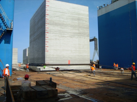 5月4日,三公司華能東方電廠碼頭項(xiàng)目開(kāi)始出運(yùn)安裝碼頭沉箱,全面掀起碼頭施工高潮。