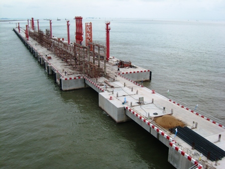欽州中石油10萬噸級碼頭工程位于廣西欽州港鷹嶺作業(yè)區(qū),2007年6月20日開工,整個碼頭呈"L"型布置,離岸式,碼頭總長609米(規(guī)模為2個10萬噸級原油卸船泊位、1個3千噸級和1個5千噸級成品油卸船泊位,預(yù)留1個3千噸級和1個5千噸級成品油泊位),碼頭面高程為+8.0米,為重力墩式結(jié)構(gòu),由一座492米×36米工作平臺,3座系纜墩及1座引橋組成,引橋長238米,采用灌注樁結(jié)構(gòu)。