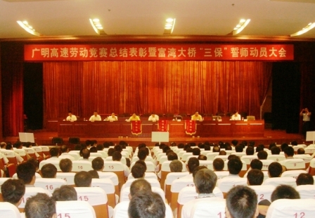 為了表彰先進、鼓舞士氣,充分調(diào)動廣大建設(shè)者的積極性,確保廣明高速公路明年4月建成通車,7月30日,廣明公司隆重舉行"廣明高速公路勞動競賽總結(jié)表彰暨富灣大橋‘保安全、保質(zhì)量、保工期’三保誓師大會",對上階段"四比四賽"勞動競賽活動中涌現(xiàn)的先進集體和個人進行表彰,為富灣大橋項目部青年突擊隊授旗。廣明高速公路各參建單位共300多人參加。