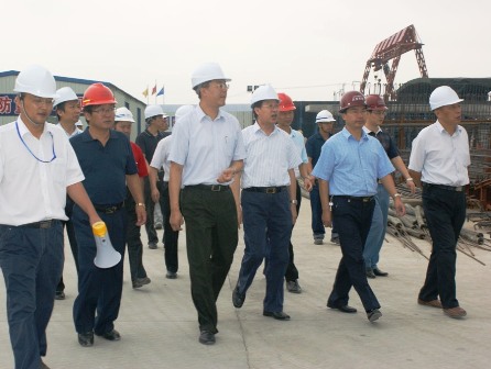 9月5日,上海市副秘書長尹弘在上海市建委孫主任、市規(guī)劃設(shè)計(jì)院等有關(guān)職能部門領(lǐng)導(dǎo)、京滬高鐵指揮部拉有玉指揮長等陪同下到四航局京滬高鐵嘉定制梁場檢查指導(dǎo)工作。