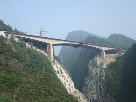 沿溪溝特大橋是渝湘高速公路控制性工程之一,位于重慶黔江區(qū)正陽鎮(zhèn)境內(nèi),跨越斷裂型溶蝕大峽谷,橋面至谷底距離約280米。分左右幅橋,橋梁與路基同寬(24.5米),由主橋和引橋構(gòu)成,共14跨(左幅6跨,右幅8跨),主橋主跨達150米,是高速公路建設(shè)領(lǐng)域全國第二的混凝土連續(xù)箱梁橋。