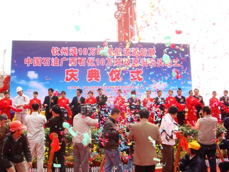 中國(guó)石油廣西石化10萬(wàn)噸級(jí)原油碼頭竣工慶典儀式于12月6日在欽州港隆重舉行。廣西壯族自治區(qū)人大副主任覃瑞祥、自治區(qū)副主席陳武、廣西北部灣國(guó)際港務(wù)集團(tuán)董事長(zhǎng)葉時(shí)湘以及欽州市委、市人民政府等領(lǐng)導(dǎo)同志出席了慶典儀式。中石油廣西石化總經(jīng)理吳恩來(lái)在慶典致詞上高度贊揚(yáng)了三公司欽州港項(xiàng)目部攻堅(jiān)克難并提前32天將碼頭交付使用、為欽州石化項(xiàng)目如期投產(chǎn)奠定了良好的基礎(chǔ)表示感謝!