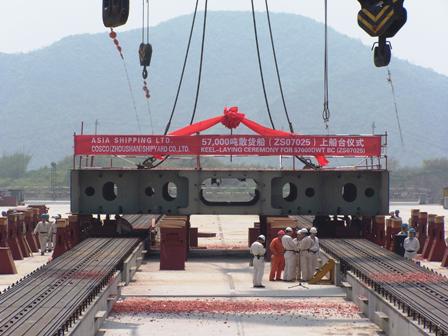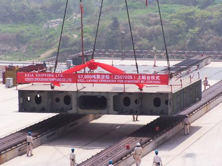 4月15日,隨著首個造船分段的順利安放,舟山中遠(yuǎn)一號船臺正式投入試生產(chǎn)。
