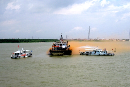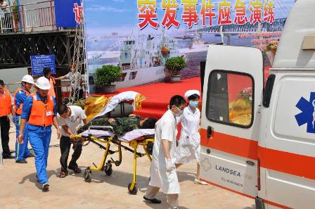 此次演練主要是針對北江進入汛期期間,正在興建的貴廣鐵路北江特大橋面臨洪汛險情重大考驗時,施工單位與海事部門如何協(xié)同作戰(zhàn)、應急處置。上午9時30分,演練正式開始,先后進行運沙船起火引起失控漂流、施工人員溺水急救和汛期設備轉(zhuǎn)移、水上漂流物清除、人員撤離等三項內(nèi)容。在接到險情報告后,應急指揮中心啟動突發(fā)事件應急快速反應系統(tǒng),嚴格按照系統(tǒng)的要求和規(guī)定進行應急處置。11時許,運沙船被控制,溺水人員得到救治,汛期險情被解除,演練取得圓滿成功。