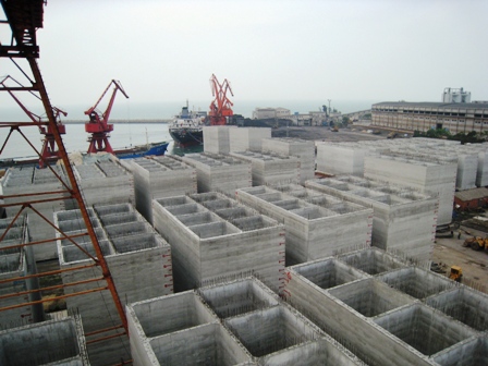 ??诟垴R村港區(qū)擴(kuò)建一期碼頭工程共需要預(yù)制、安裝沉箱75件,于2008年6月26日開(kāi)始預(yù)制,第一批44件沉箱于2008年11月26日預(yù)制完成。目前,已安裝沉箱60件,胸墻澆筑的各項(xiàng)準(zhǔn)備和其各個(gè)工序的施工工作正有條不紊地進(jìn)行。