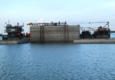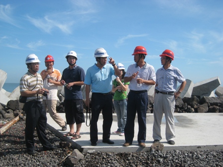 黃副局長認真聽取了項目部施工負責(zé)人的匯報后,在項目部領(lǐng)導(dǎo)的陪同下,到碼頭施工現(xiàn)場參觀了沉箱出運安裝、碼頭后方棱體拋理及倒濾層、護岸擋浪墻工、扭王塊出運及安裝等工序的施工。他指出,項目部沉箱安裝進度及質(zhì)量水平相當(dāng)?shù)轿?,同時對其他正進行的各分項施工質(zhì)量、進度及安全也表示滿意,希望項目部再接再厲發(fā)揚優(yōu)良傳統(tǒng),保質(zhì)、保量、安全地完成下階段施工。
