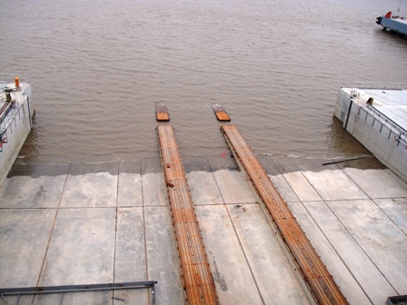 1號(hào)、2號(hào)船臺(tái)工程包括船臺(tái)主體工程、船臺(tái)突堤、陸域吊車道、直立式駁岸和東駁岸架空過渡段等。單個(gè)船臺(tái)主體長250米,寬45米,水下段長60米,船臺(tái)滑道坡度1:20;船臺(tái)突堤長92米,寬21米;陸域吊車道四組。