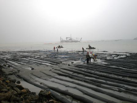 軟體排施工是北護岸施工的一項主要內(nèi)容,該施工區(qū)域長894.2米,寬30米,采用人工鋪設(shè)軟體排施工工藝。施工中,項目部員工認(rèn)真負責(zé),努力克服了設(shè)計變更、潮差以及與吹填單位交叉作業(yè)等困難,確保了分項工程的順利完成。目前,項目部正積極籌備Ⅱ標(biāo)工程的施工建設(shè)。