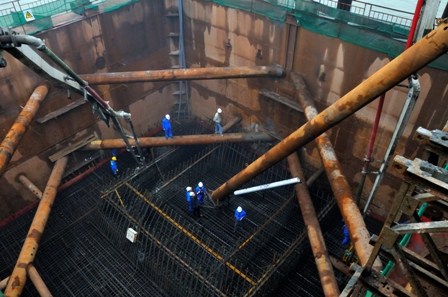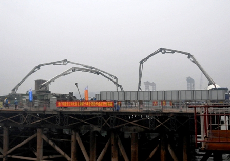 244號(hào)主墩承臺(tái)長(zhǎng)35米,寬17米,高6米,砼方量達(dá)3570立方米,單體一次性澆筑方量居四航局之首。面對(duì)困難,貴廣三項(xiàng)目部精心組織,多次召開(kāi)施工動(dòng)員會(huì)和承臺(tái)施工技術(shù)交底會(huì),認(rèn)真安排、詳細(xì)部署,并組織承臺(tái)專(zhuān)項(xiàng)質(zhì)量安全生產(chǎn)大檢查,確保施工萬(wàn)無(wú)一失。4月18日10時(shí)15分,該部?jī)勺鶖嚢枵?、四條生產(chǎn)線同時(shí)開(kāi)動(dòng)全速生產(chǎn),25臺(tái)攪拌車(chē)、5個(gè)卸料點(diǎn)不間斷下料,高峰下料速度達(dá)到每小時(shí)160立方米以上。經(jīng)過(guò)一百多名技術(shù)人員的持續(xù)努力,最終比預(yù)計(jì)時(shí)間縮短8小時(shí)順利完成澆筑。