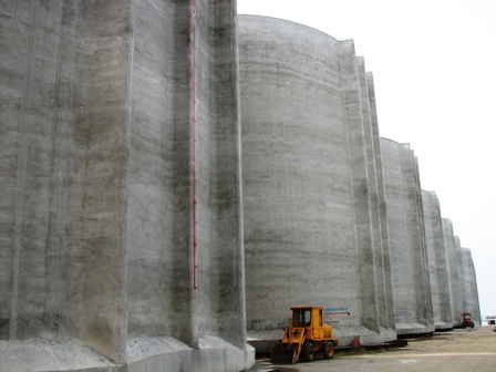 該工程共需預(yù)制圓筒90件,其中前3個(gè)澆筑的巨型圓筒外徑21.0米,筒高22.5米,單段筒寬21.95米,重2600噸,為當(dāng)時(shí)國內(nèi)體積最大最高的圓筒之一。該工程自2009年11月開工以來,項(xiàng)目部統(tǒng)籌調(diào)配資源,合理推進(jìn)施工,認(rèn)真做好工藝銜接,努力加快預(yù)制進(jìn)度,確保了圓筒預(yù)制順利完工。