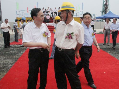 廣東省委常委、常務(wù)副省長朱小丹在湛江市委書記、市人大常委會主任劉小華,四航局董事長、黨委書記梁卓仁等人陪同下,來到北護岸觀禮臺,察看了30萬噸大型散貨碼頭的沉樁施工,梁卓仁向朱小丹介紹了30萬噸大型散貨碼頭的施工組織與計劃。
