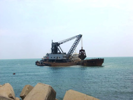 該工程包括2個(gè)1萬(wàn)噸泊位,可以兼靠3個(gè)5千噸級(jí)船舶。工作內(nèi)容包括:3、4號(hào)泊位的所有挖泥、炸礁、拋石、夯實(shí)、整平等基礎(chǔ)施工,沉箱預(yù)制、儲(chǔ)存、運(yùn)輸、安裝等所有墻身主體結(jié)構(gòu)施工等。針對(duì)該工程土質(zhì)較硬的特點(diǎn),洋浦項(xiàng)目部經(jīng)過(guò)充分討論分析后,選擇了斗重為120噸的目前國(guó)內(nèi)最大的挖泥船進(jìn)場(chǎng)施工,力爭(zhēng)闊別20多年后在海南洋浦再造精品工程。