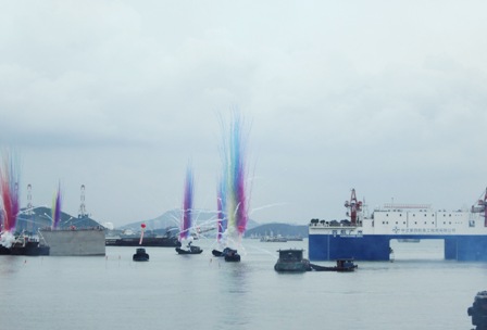 上午8點55分,所有嘉賓到安裝水域現(xiàn)場觀看“四航廣州號”浮船塢下潛。中午12點15分,隨著流星火箭噴出,海上彩煙升空,彩球飄搖,5800噸沉箱緩緩從“四航廣州號”浮船塢中拖出,慶典活動達(dá)到了高潮。