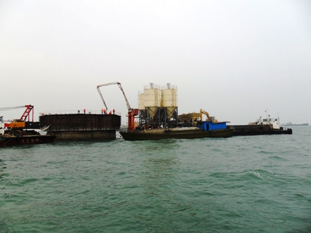 施工中,項目部克服了施工區(qū)域距離陸地較遠、施工環(huán)境惡劣等難題,經(jīng)過21小時奮戰(zhàn)澆筑完成第一段胸墻,標志著該碼頭主體工程施工進入新的階段。