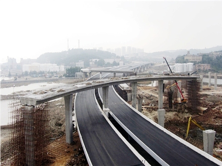 該工程按照城市I級主干道標準設計與施工,由左右幅兩個主線橋與六個匝道橋組成,雙向六車道,左右兩幅主線橋長共1642米,寬度均為12.75米。為保證橋面瀝青鋪裝層的施工質量,項目部在瀝青混凝土配合比、瀝青混凝土溫度、現(xiàn)場施工等各個環(huán)節(jié)進行嚴格控制,有效保證了整體鋪裝施工質量。經(jīng)檢測,橋面鋪裝的厚度、壓實度、平整度、滲水系數(shù)、構造深度、摩擦系數(shù)等技術指標均符合設計及規(guī)范要求,施工進度和質量得到業(yè)主、監(jiān)理及質監(jiān)站的一致肯定。