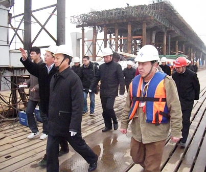 陳啟濤一行親切看望和慰問了春節(jié)期間堅守在工地的項目部工程建設(shè)人員。在南岸17號墩鋼箱梁施工現(xiàn)場,陳書記認真聽取了項目部關(guān)于施工進度、安全、質(zhì)量等情況的匯報,詳細詢問了箱梁制作及頂推施工情況,高度肯定了項目部為蚌埠“三年大建設(shè)”所做出的積極貢獻。他強調(diào),今年是大橋施工的決戰(zhàn)年,希望項目部再接再厲,迎難而上,確保順利實現(xiàn)2013年元旦通車的目標。