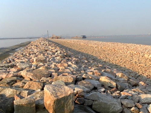 本工程采用充填砂袋結(jié)構(gòu)施工,其中,北圍堰為210米的延長(zhǎng)段,東圍堰為長(zhǎng)1832米,分隔圍堰1088米,南圍堰1034.57米,西圍堰1832米,設(shè)計(jì)圍堰頂標(biāo)高5.8m,頂寬2m。工程于2011年01月10日開工,2011年12月05日完工。