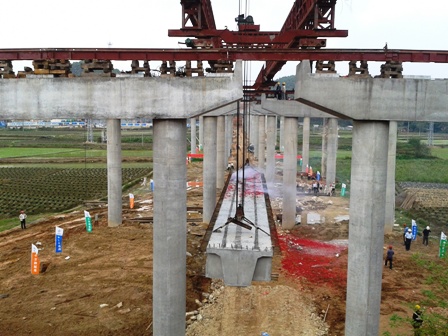 螺洞大橋位長350米,共14跨,每跨25米,每跨有10片箱梁,起重設(shè)備采用專業(yè)的箱梁安裝設(shè)備100t門吊式架橋機,以高低吊的方法架設(shè)、安裝。廣明高速公路延長線工程全線共有蓋帽梁156個、箱梁710片、樁基601根、墩柱363根。在天氣等施工環(huán)境良好的情況下,每天可架設(shè)5片以上箱梁。