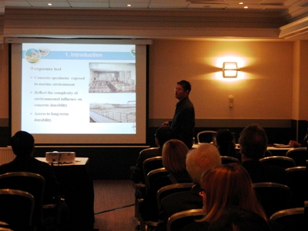 本次會(huì)議圍繞水泥基復(fù)合材料的耐久性問題展開學(xué)術(shù)交流與討論。會(huì)上,四航研究院黎鵬平博士做了題為“The Correlativity between Exposure Test and Accelerated laboratory Test for concrete Performance of Resistance to Chloride ion”的學(xué)術(shù)報(bào)告,報(bào)告主要內(nèi)容是暴露試驗(yàn)與室內(nèi)試驗(yàn)相關(guān)性研究,首次建立了現(xiàn)場(chǎng)耐久性質(zhì)量控制的室內(nèi)快速試驗(yàn)的測(cè)試結(jié)果與暴露試驗(yàn)的表觀氯離子擴(kuò)散系數(shù)的關(guān)系,引起參會(huì)者強(qiáng)烈反響。