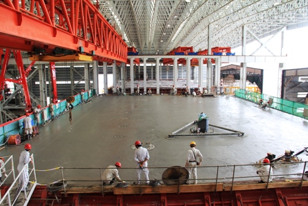 2012年4月29日,港珠澳島隧項目部正式開始沉管預(yù)制工作,首段E1管節(jié)共有5個節(jié)段,每個節(jié)段鋼筋籠重約900噸。澆筑后的節(jié)段長22.5米,寬37.95米,高11.4米,底板和頂板厚1.5米,側(cè)墻厚1.5米,中隔墻厚0.8米 ,重量超過9000噸,平均每個節(jié)段澆筑時間為36小時左右。