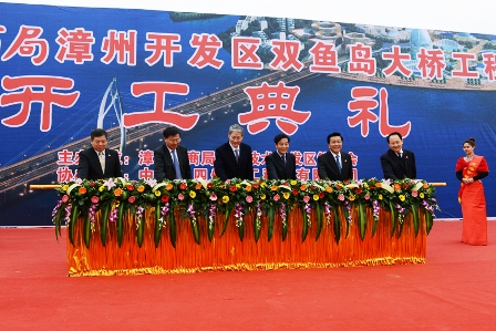 12月27日上午,雙魚島大橋工程開工典禮隆重舉行,招商局集團董事長傅育寧,招商局集團總裁李建紅,招商局集團副總裁、漳州開發(fā)區(qū)管委會主任胡政,漳州市委副書記吳曉丁,招商局集團總經(jīng)濟師王宏,漳州開發(fā)區(qū)黨委書記、管委會常務副主任吳斌出席開工典禮并共同為雙魚島大橋開工推動啟動桿。五公司總經(jīng)理、黨委書記楊茯苓出席了開工典禮。