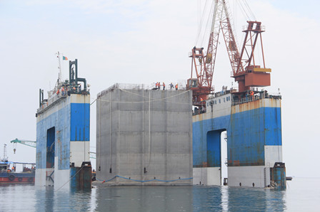 該工程包括1個4萬噸級多用途泊位及1個5萬噸級集裝箱泊位(結(jié)構(gòu)按7萬噸級設(shè)計),為沉箱重力式碼頭,由33件2420噸沉箱組成,為喀麥隆基建史上最大的沉箱。為了確保首件沉箱順利出運安裝,項目部多次組織相關(guān)部門及技術(shù)人員召開技術(shù)、安全交底專題會,討論并制定出完善的施工方案,先后克服了船機設(shè)備維修、作業(yè)工人經(jīng)驗不足等客觀因素的影響,積極組織協(xié)調(diào)人員、機械設(shè)備投入施工生產(chǎn),把握潮水變化規(guī)律,科學(xué)施工,優(yōu)質(zhì)、安全地完成首件沉箱的安裝,為順利完成沉箱出運任務(wù)積累寶貴經(jīng)驗。