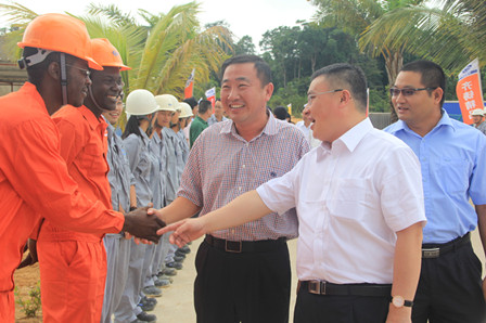考察調(diào)研期間,梁卓仁與項目員工及當?shù)毓と伺e行了座談,了解了他們海外工作、生活需求,現(xiàn)場解答了員工們的疑惑,并向大家送上了端午節(jié)的問候,通報了公司上半年各項指標完成情況。梁卓仁鼓勵當?shù)毓と嗽诟髯詬徫簧习l(fā)揮潛能,多做貢獻。梁卓仁一行還慰問了駐扎項目提供安全保障的BIR特種部隊與憲兵隊,送上了祝福和問候,感謝他們的辛勤付出。