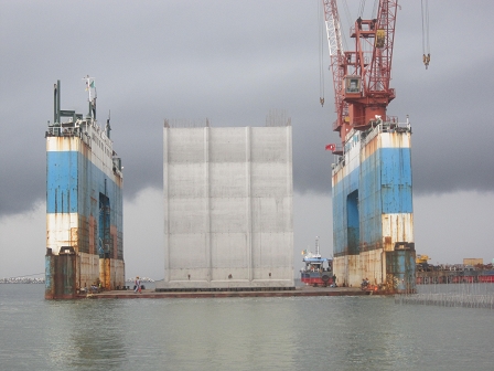 該分項(xiàng)工程共有沉箱33件,單件沉箱砼量為967m3,重約2420t,為喀麥隆基建史上最大的沉箱,分兩批出運(yùn)安裝,第一批安裝21件,第二批安裝12件。自5月30號(hào)首件沉箱出運(yùn)以來(lái),項(xiàng)目部先后克服了船機(jī)設(shè)備維修、作業(yè)工人經(jīng)驗(yàn)不足等客觀因素的影響,多次組織相關(guān)部門及技術(shù)人員召開技術(shù)、安全交底專題會(huì),討論并制定出完善的施工方案,并多次邀請(qǐng)到四航局、三公司等各級(jí)業(yè)務(wù)管理部門的多位技術(shù)專家進(jìn)場(chǎng)進(jìn)行技術(shù)指導(dǎo),現(xiàn)場(chǎng)解決項(xiàng)目實(shí)施過程中出現(xiàn)的技術(shù)難題,積極組織協(xié)調(diào)人員、機(jī)械設(shè)備投入施工生產(chǎn),根據(jù)天氣變化規(guī)律見縫插針進(jìn)行施工,實(shí)現(xiàn)每?jī)商煲患鲞\(yùn)與安裝沉箱,有效地提高了工作效率,順利完成了該分項(xiàng)施工任務(wù)。