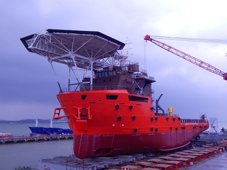 日前,航通公司承建的兩艘85米多用途海洋平臺(tái)工作船分別完成下水,這是航通公司目前所承建的最大的海工輔助工作船。