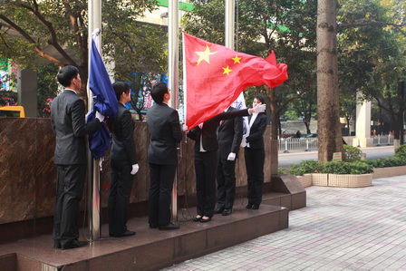 伴隨著《國歌》、《四航之歌》的鏗鏘旋律,五星紅旗和中國交建司旗在公司6名旗手護(hù)衛(wèi)下徐徐升起,本部全體員工肅立仰望,向五星紅旗和中國交建司旗行注目禮,自豪和神圣感油然而生。