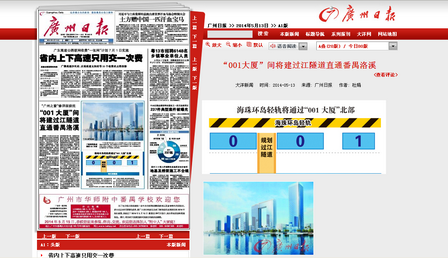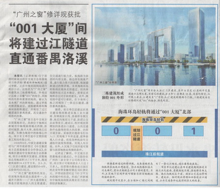 5月13日,《廣州日報》A1版以《“廣州之窗”修詳規(guī)獲批——“001大廈”間將建過江隧道直通番禺洛溪》為題,詳細報道了四航局“廣州之窗”項目。
