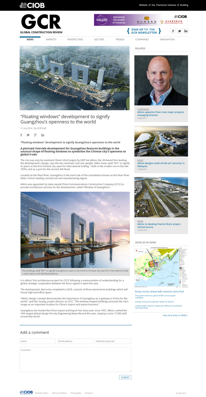 近日,中交南方總部“廣州之窗”項(xiàng)目開(kāi)始在Global construction review、Building design、Global tall news等國(guó)際媒介上對(duì)外展示,展示內(nèi)容主要包括項(xiàng)目建筑形態(tài)、設(shè)計(jì)理念、項(xiàng)目建設(shè)對(duì)廣州城市發(fā)展的意義等,拉開(kāi)了“廣州之窗項(xiàng)目”全球推廣的序幕。