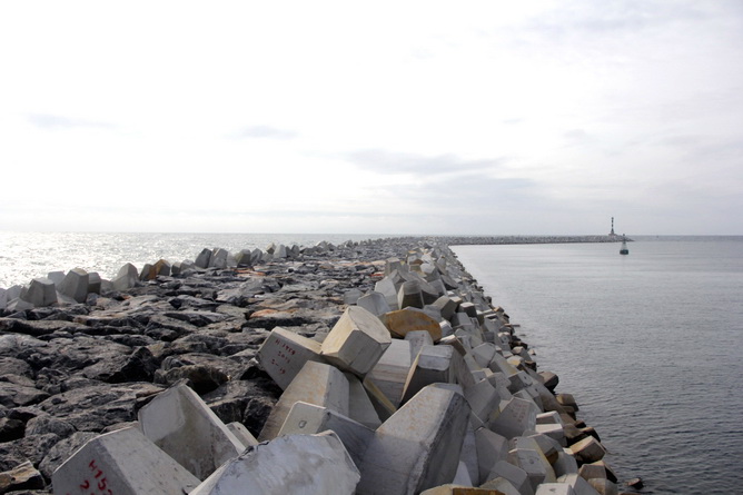 該防波堤全長1355米,為斜坡式防波堤,碼頭岸線內(nèi)設(shè)543米擋浪墻,防波堤位置最大水深約14米,平均水深約8米。施工內(nèi)容包括鋪設(shè)堤心石64萬立方米、墊層石15萬立方米、護面塊體3.1萬件共55000立方米、現(xiàn)澆擋浪墻及燈塔基礎(chǔ)9000立方米等。