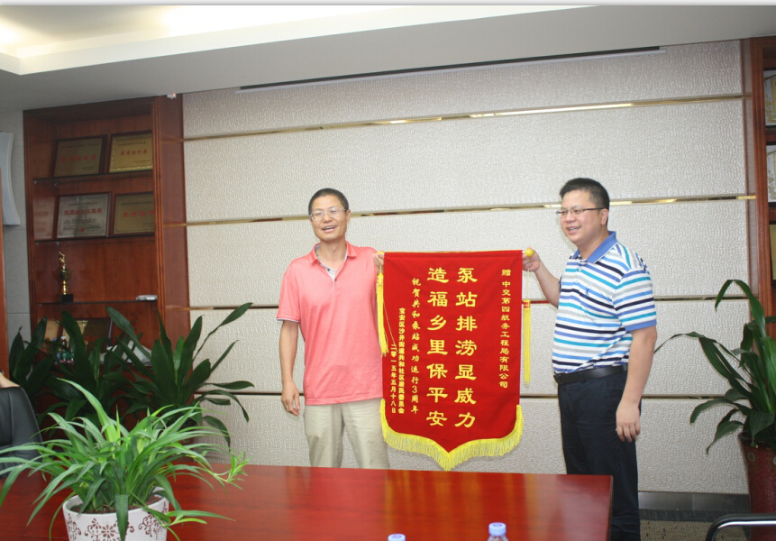 5月26日,深圳市寶安區(qū)沙井街道共和村黨支部書(shū)記黎仕生一行三人專程到深圳市水務(wù)工程建設(shè)管理中心,代表村民向共和泵站工程建設(shè)及代運(yùn)管單位——中交四航局贈(zèng)送題為“泵站排澇顯威力,造福鄉(xiāng)里保平安”的錦旗,感謝四航局對(duì)共和泵站施工建設(shè)、運(yùn)管排澇的貢獻(xiàn)。