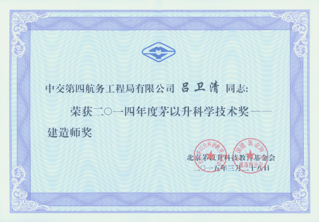 四航局呂衛(wèi)清榮獲"2014年度茅以升科學(xué)技術(shù)獎(jiǎng)--建造師獎(jiǎng)"