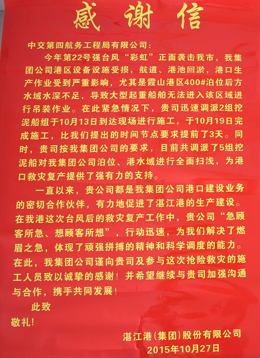 10月27日,四航局收到湛江港(集團)股份有限公司發(fā)來的感謝信,對公司在強臺風(fēng)“彩虹”救災(zāi)復(fù)產(chǎn)工作中對湛江港的支持表示感謝。