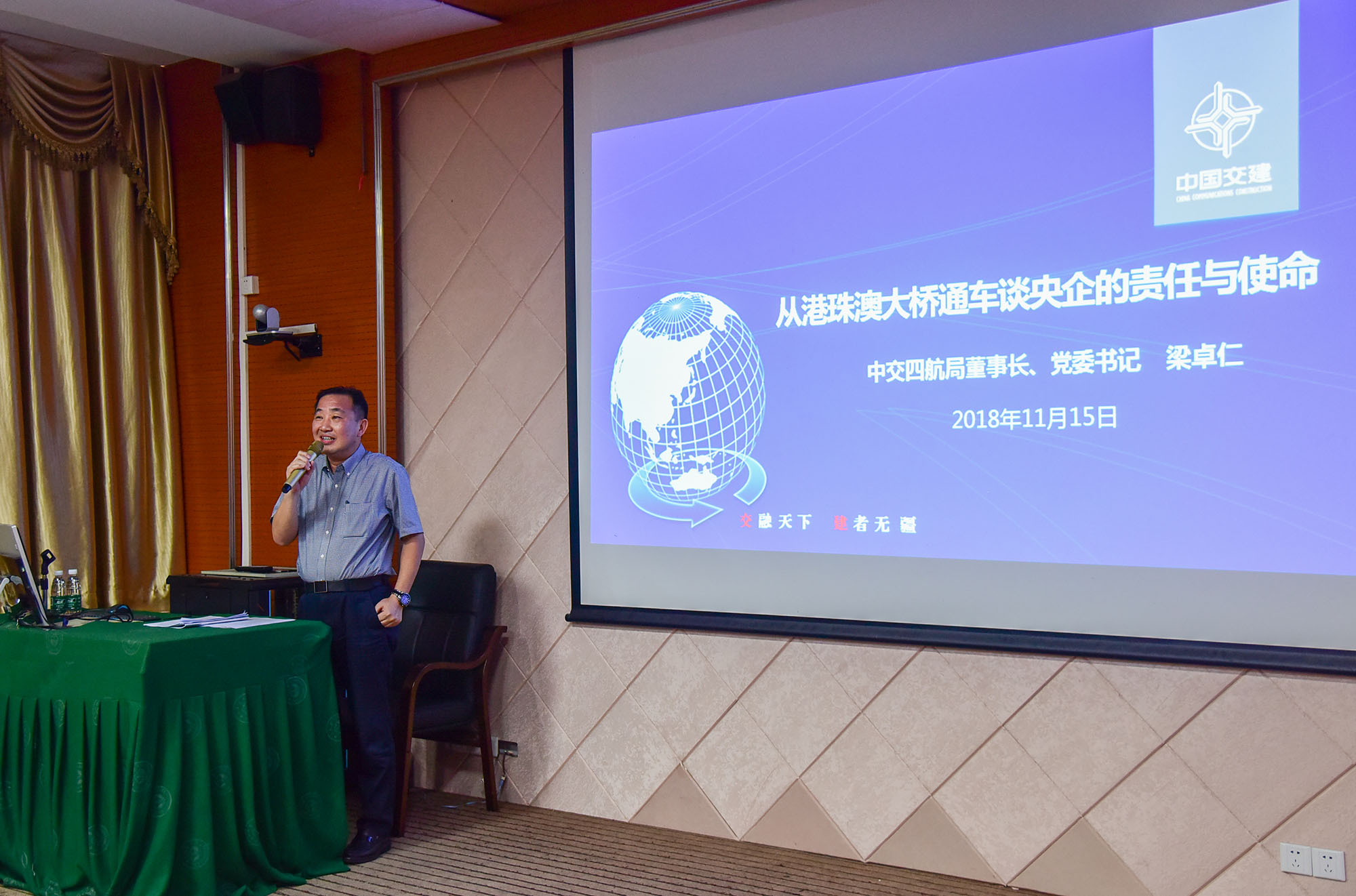 專家講座上,梁卓仁以四航局參建的港珠澳大橋順利開(kāi)通為序,講述了四航建設(shè)者參與港珠澳大橋建設(shè)的光輝歷程,生動(dòng)詮釋了建設(shè)者們 “一塵不染”的工作理念和“每一節(jié)沉管都是第一節(jié)沉管”的工匠精神;通過(guò)講述“改革開(kāi)放第一爆”、“四分錢(qián)驚動(dòng)中南海”等歷史故事,展現(xiàn)了四航人“敢闖敢試、敢為人先”的改革創(chuàng)新精神;以斯里蘭卡科倫坡港、蒙內(nèi)鐵路以及巴基斯坦瓜達(dá)爾港等工程建設(shè)中的四航故事,闡述了央企踐行“一帶一路”倡議的責(zé)任和使命;以海南工程的感人事跡,彰顯出四航人“能打硬仗、打勝仗 ”的決心和擔(dān)當(dāng)。他強(qiáng)調(diào),中央企業(yè)是中國(guó)特色社會(huì)主義經(jīng)濟(jì)的“頂梁柱”,堅(jiān)持黨的領(lǐng)導(dǎo)、加強(qiáng)黨的建設(shè),是國(guó)有企業(yè)的“根”和“魂”。