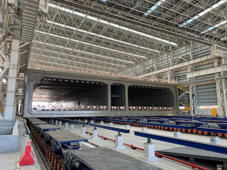 7月16日,四航局自主研發(fā)制造的八萬(wàn)噸鋼殼管節(jié)整體移運(yùn)成套設(shè)備(智能臺(tái)車(chē))正式投產(chǎn),順利完成深中通道E1鋼殼管節(jié)從卸駁區(qū)到澆筑區(qū)的移運(yùn)工作。
