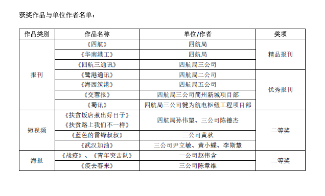 10月14日至15日,全國工程建設行業(yè)2020年企業(yè)文化大會和首屆媒體作品大賽在成都舉行,活動由中國施工企業(yè)管理協(xié)會主辦,大會對首屆工程建設行業(yè)傳媒作品大賽優(yōu)秀作品進行了表彰。此次大賽共有來自全國工程建設行業(yè)300余家企業(yè)參加,共計收到超過600份參賽作品,超過200家單位入圍報刊評選。四航局獲得14個獎項。其中,《四航》雜志、《華南港工》報、《四航三通訊》獲得精品報刊,《四航》雜志以第一名的比賽成績位列榜首,連續(xù)12年獲得全國工程建設行業(yè)金獎報刊。此外,4個報刊作品獲評優(yōu)秀報刊,4個短視頻、2個海報作品均獲二等獎。